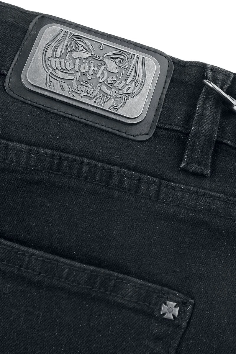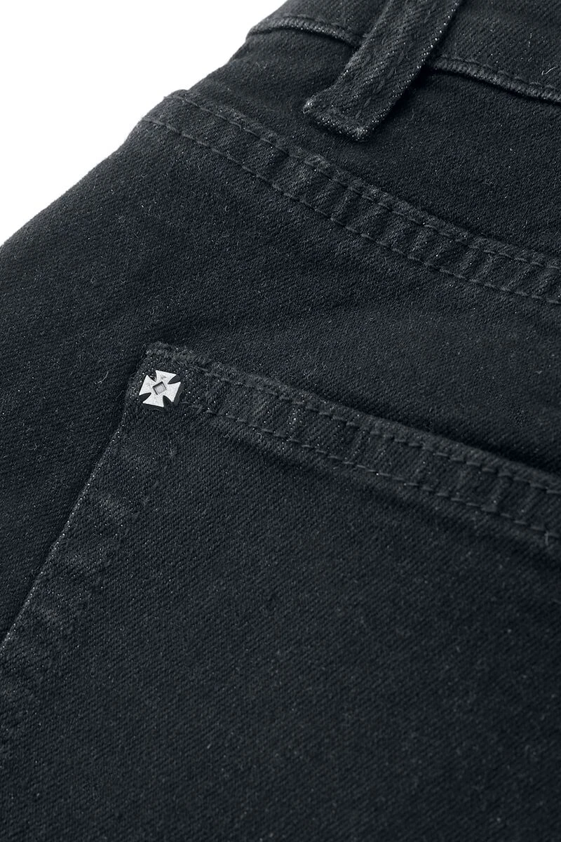 – Faux-leather patch with metal appliqué on the back hem